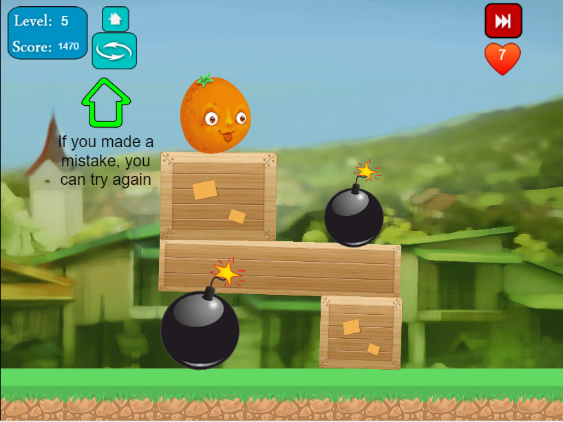 Главный герой игры апельсин, он стоит на коробках и платформах. Он очень боится высоты, поэтому вы должны помочь ему добраться до земли, убрав эти коробки и платформы. Но будьте осторожны, с каждым уровнем могут появляться новые опасные предметы (бомбы и кактусы), если апельсин прикоснётся к ним, вы потеряете одну жизнь! Вначале вам дается 5 жизней, также вы можете заработать дополнительные жизни в игре. Всего в игре 20 уровней, постарайтесь пройти их все и заработать много очков!