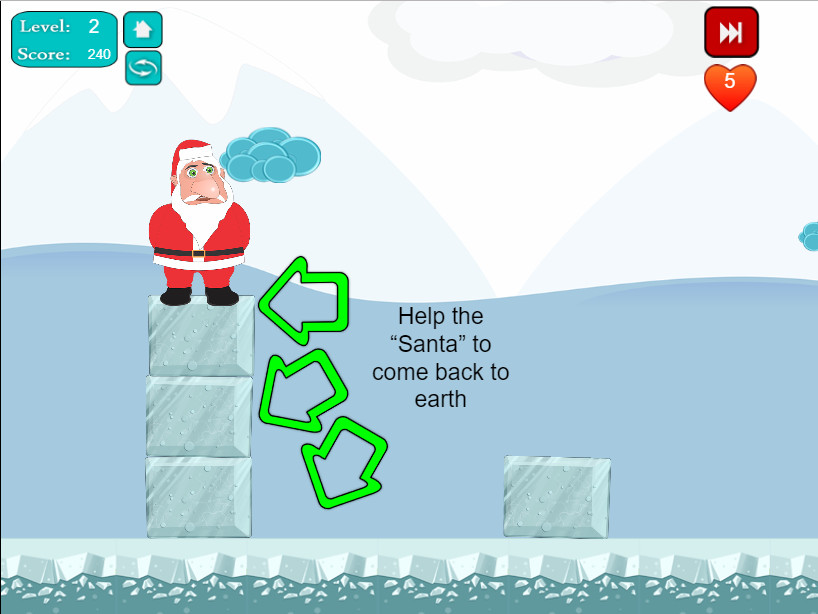 Это игра-головоломка с интересной физикой. Вы должны помочь Санта-Клаусу добраться до земли целым и невредимым, убирая кубики льда у него из-под ног. В игре 20 уровней, с каждым уровнем игра становится все сложнее и сложнее. Игра полностью оптимизирована, это значит, что вы можете играть в нее как на телефоне, так и на компьютере.