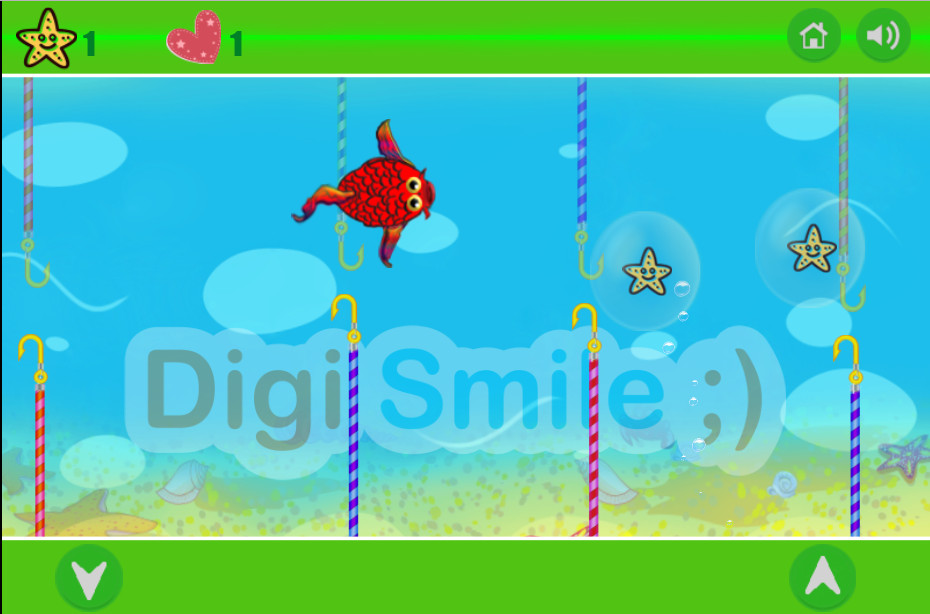 | Вы золотая рыбка и живете в реке. На реке очень много рыбаков, из-за чего река вся усыпана рыболовными крючками. Вам нужно постараться не попасться на эти крючки (вы можете проплыть сквозь прозрачные крючки на леске) и проплыть как можно дальше. По пути не забывайте собирать морские звезды, они приносят вам очки, также если вы соберете 10 звезд – вы получите дополнительную жизнь! |