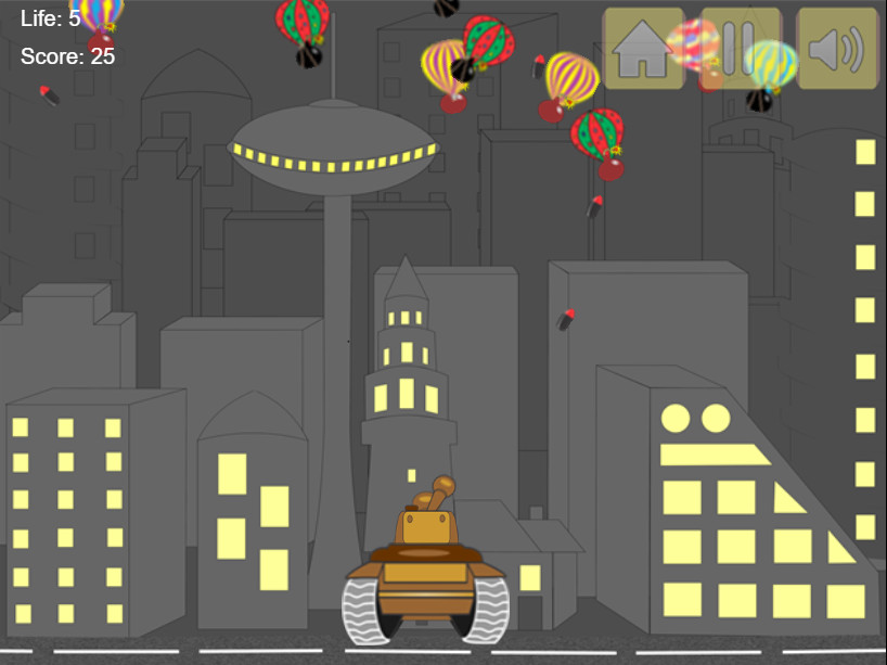 | Начните битву за будущее своего народа. Сохраните свой город от захватчиков, которые пытаются его разбомбить! Вам как самому бесстрашному танкисту на передовой, нужно стрелять по бомбам пока они не достигли земли. Бомбы летят с разной скоростью и каждый раз, когда бомба падает на землю, вы теряете одну жизнь. Бейтесь до конца, пока жизни не закончатся! |