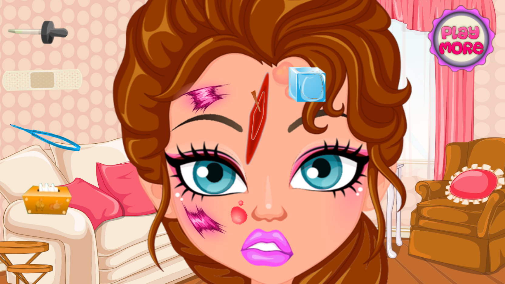 Девочку похоже кто-то избил или она проехалась своим личиком по земле. Но прежде чем разбираться, как это случилось, нужно ее вылечить. Вам нужно будет обработать все раны, и в этом помогут ваши инструменты.