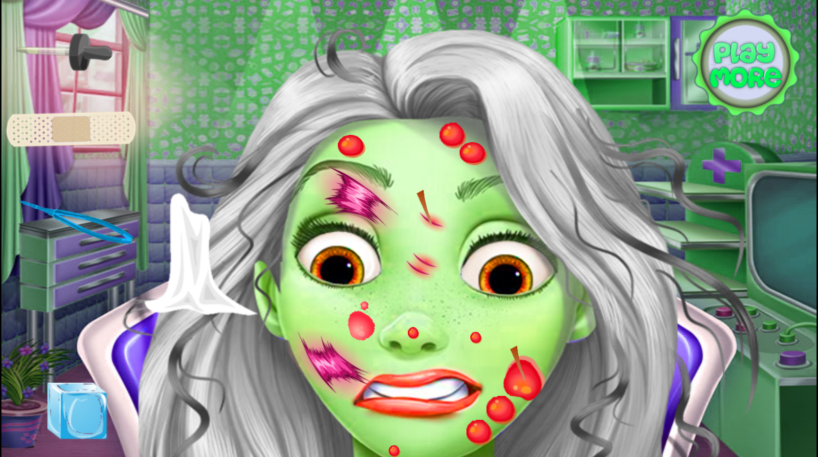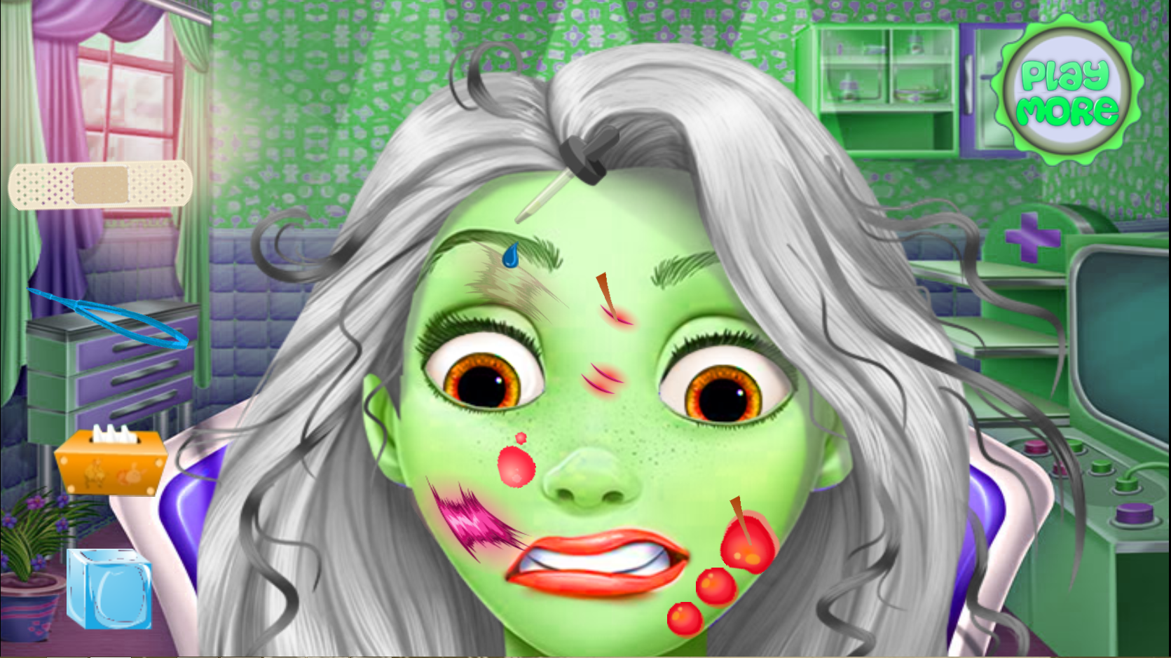 В мире свирепствует эпидемия зомби! Эта участь не обошла и нашу любимую принцессу. Но мы не можем оставить ее в беде. Чтобы исцелить ее, нам нужно полностью вылечить раненое личико принцессы. В этом нам помогут шипцы, перекись водорода, салфетки и пластырь.