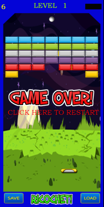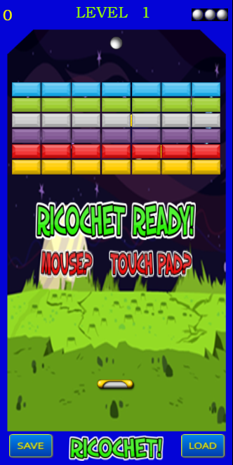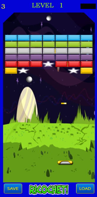 | Вам скучно и хочется убить время? Если да, то вам обязательно понравится! Интересная игра, про то как вы управляя платформой отбиваете мячик в блоки, зарабатывая очки. Отличное звуковое сопровождение и приятная графика-это все что вас ждет в Ricoshet. Так же в игре присутствуют сохранения. По статистике, только 1% людей, доходят до 10 уровня, а сможешь ли ты?Попробуйте и вас обязательно затянет эта увлекательная игра!" |